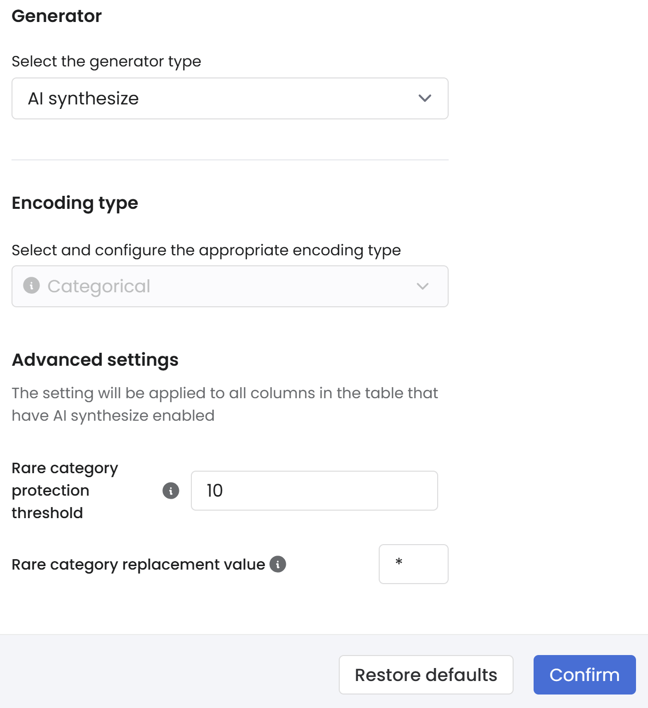 Under the **Encoding type >** [**Advanced settings**](#advanced-column-settings), the [**Rare category protection** **settings**](#rare-category-protection) will appear, which can be used to protect rare categories. These categories could potentially re-identify outliers within the synthetic data.