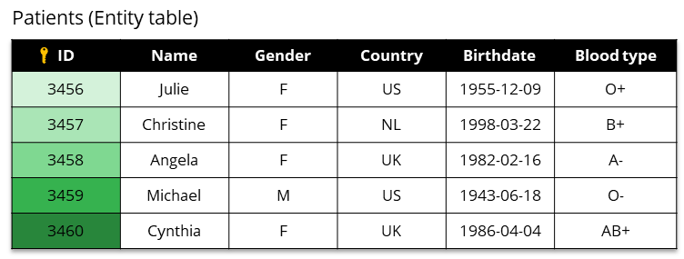 <figure><img src="https://content.gitbook.com/content/U61B9DqtWCNO3Z30vnjh/blobs/dv8WEHy9id8LQrcDKS4R/image.png" alt=""><figcaption><p>Example of an entity table (each row describes an individual patient, and be treated independently)</p></figcaption></figure>