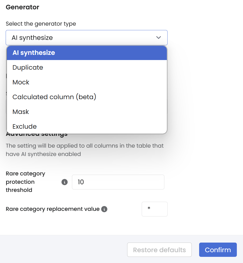 3. Under **Column parameters** > **Generator,** select AI synthesize to enable Syntho's machine learning (ML) models to automatically synthesize the data in your tables.