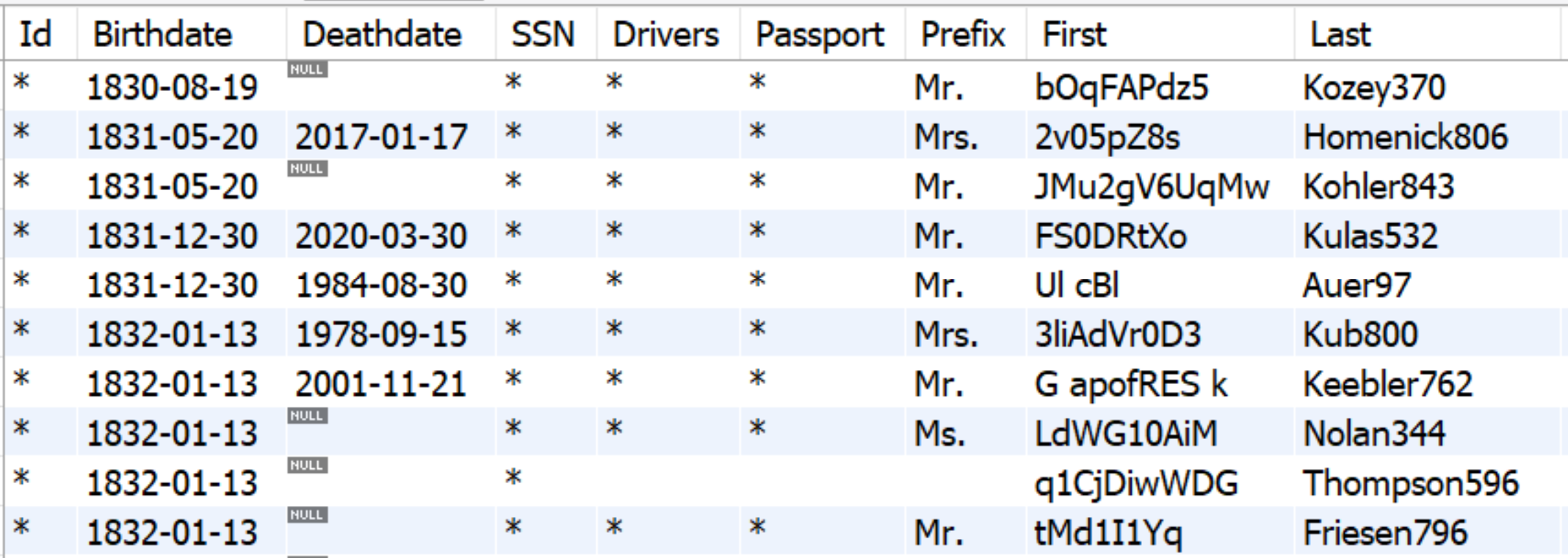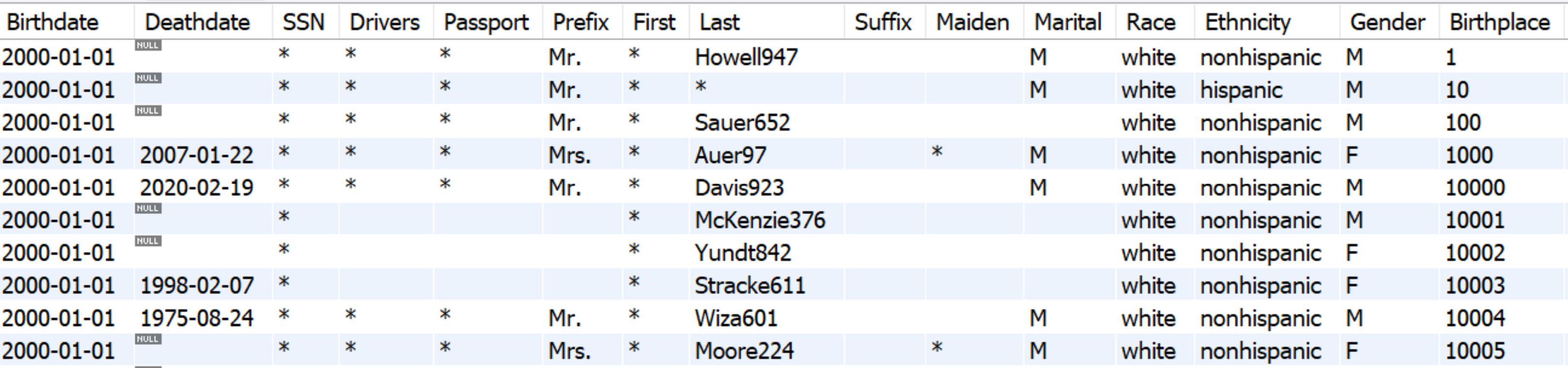 In the case below, the columns "Birthdate" and "Birthplace" are applied "hash" and "generate", respectively.
