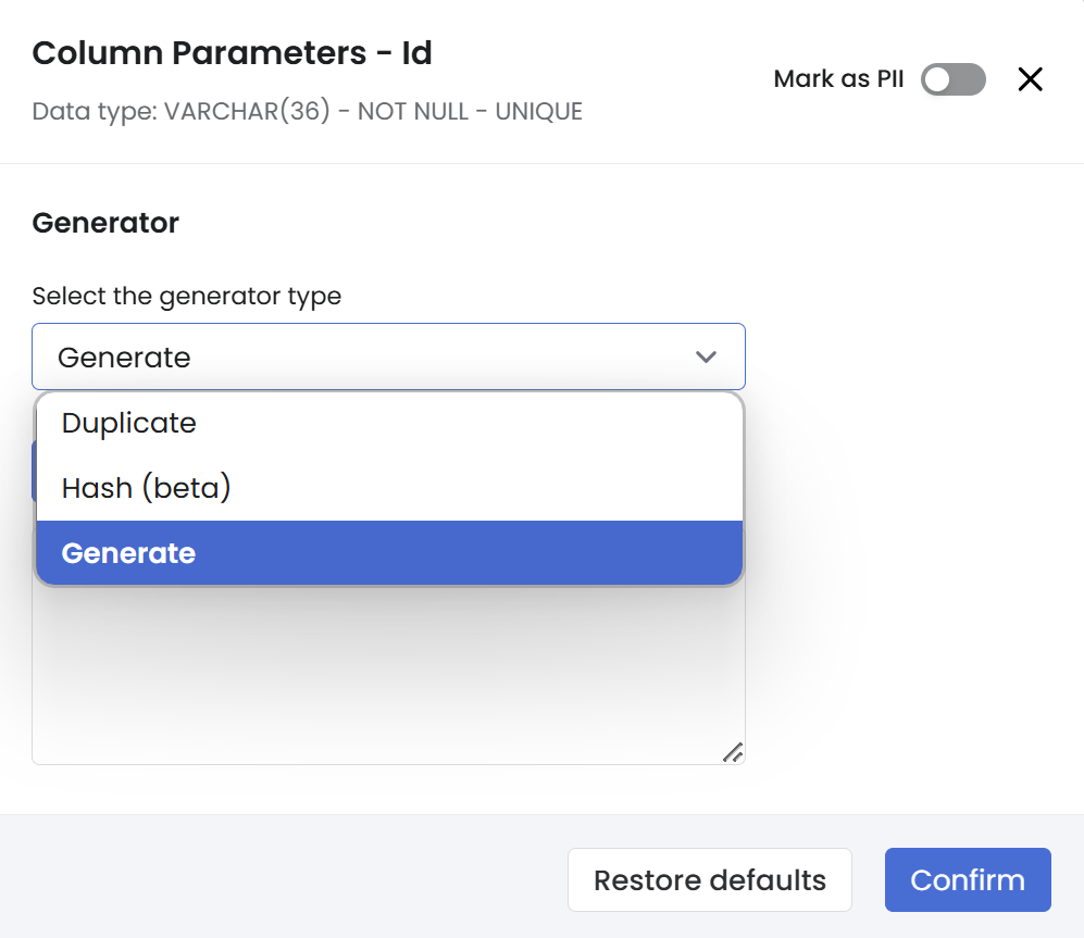 Go to **Column settings > Generation Method**, and select one of the available methods: **Duplicate**, **Generate** or **Hash**.