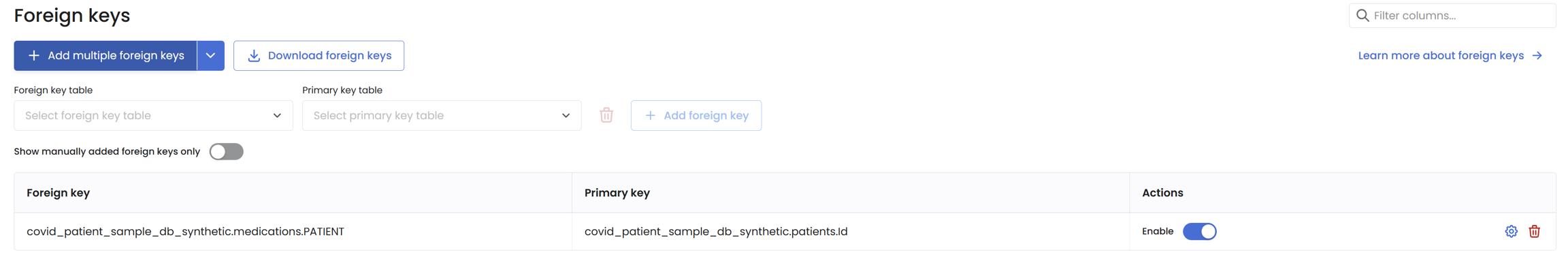 On the Foreign keys tab, select the tables containing the foreign key and primary key columns. You can also add composite foreign keys and primary keys by selecting multiple columns.