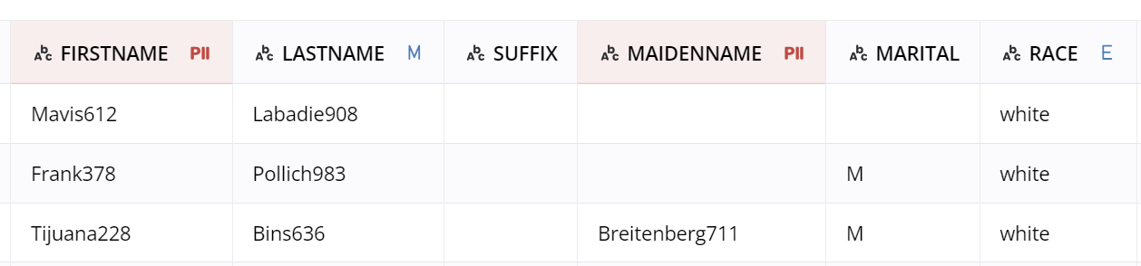 <figure><img src="https://content.gitbook.com/content/U61B9DqtWCNO3Z30vnjh/blobs/69IPfStQHdpG2p9f9iVw/Screenshot%202024-09-17%20160300.png" alt=""><figcaption><p>Columns "FIRSTNAME" and "MAIDENNAME" is detected as PII but no Mocker, Mask, Calculated Column or Exclude is applied</p></figcaption></figure>