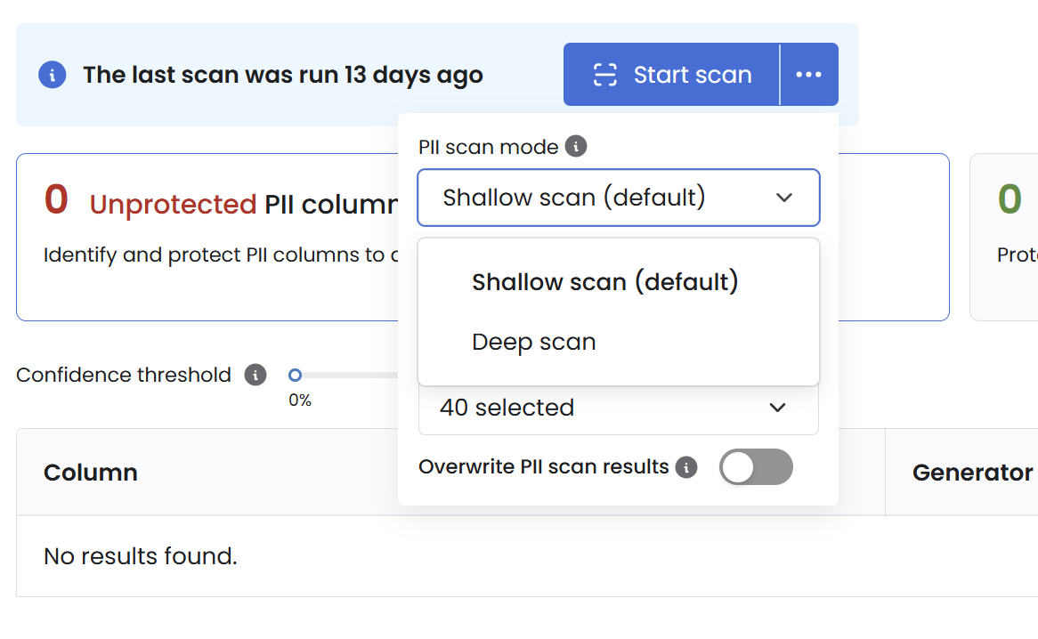 You can launch a **metadata** PII scan or a **data** PII scan. The metadata scan runs faster, since it is based on the name of an individual column on which regular expression rules are applied. On the other hand, the data scan is likely to be more accurate in detecting PII columns, since it analyses the data inside the column using state of the art natural language processing models.