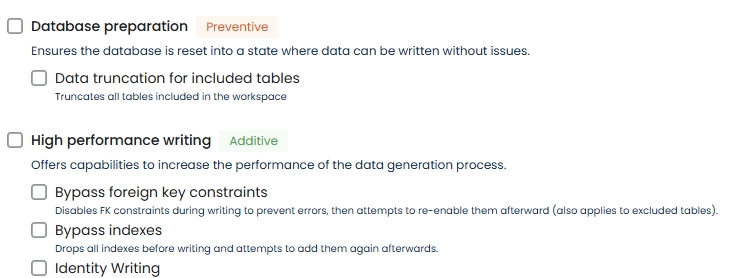 In the second step of the data generation wizard, you can configure additional functionalities to control how Syntho prepares your database and optimizes writing performance. These settings help ensure smooth data generation and can significantly improve performance when working with large datasets.