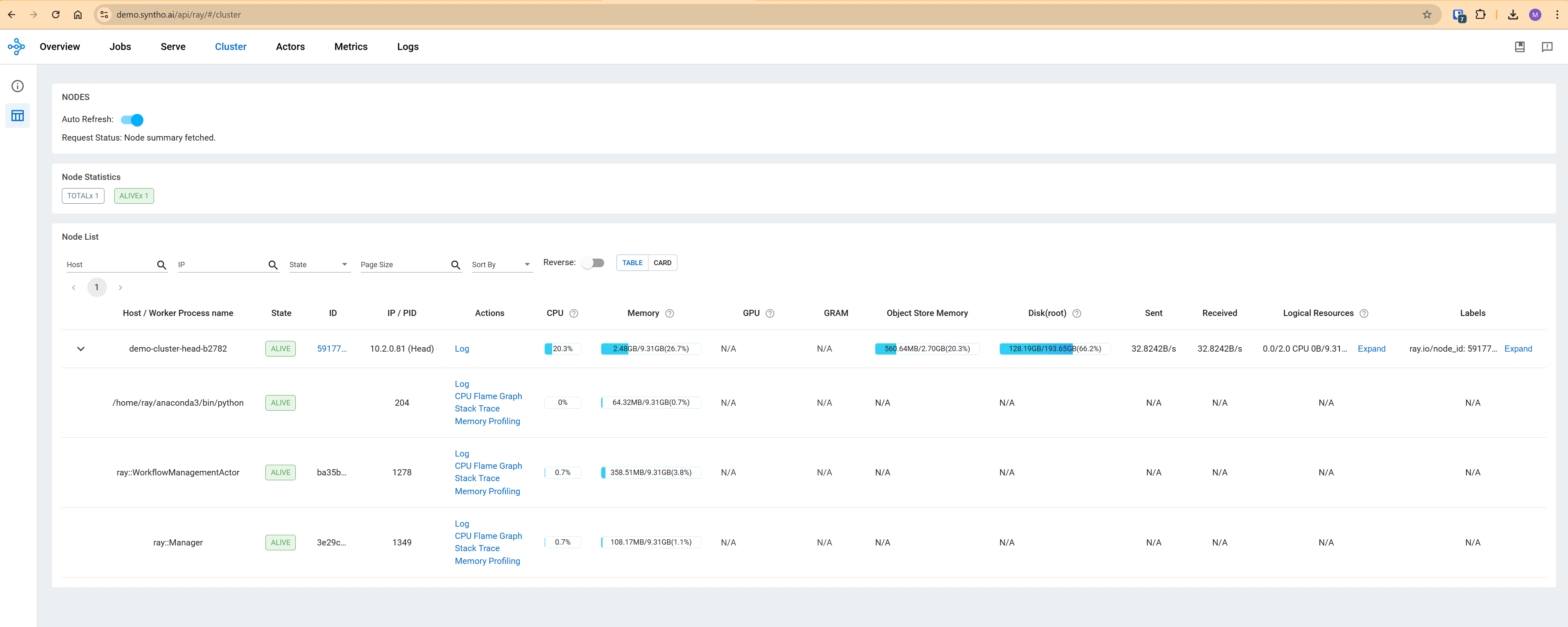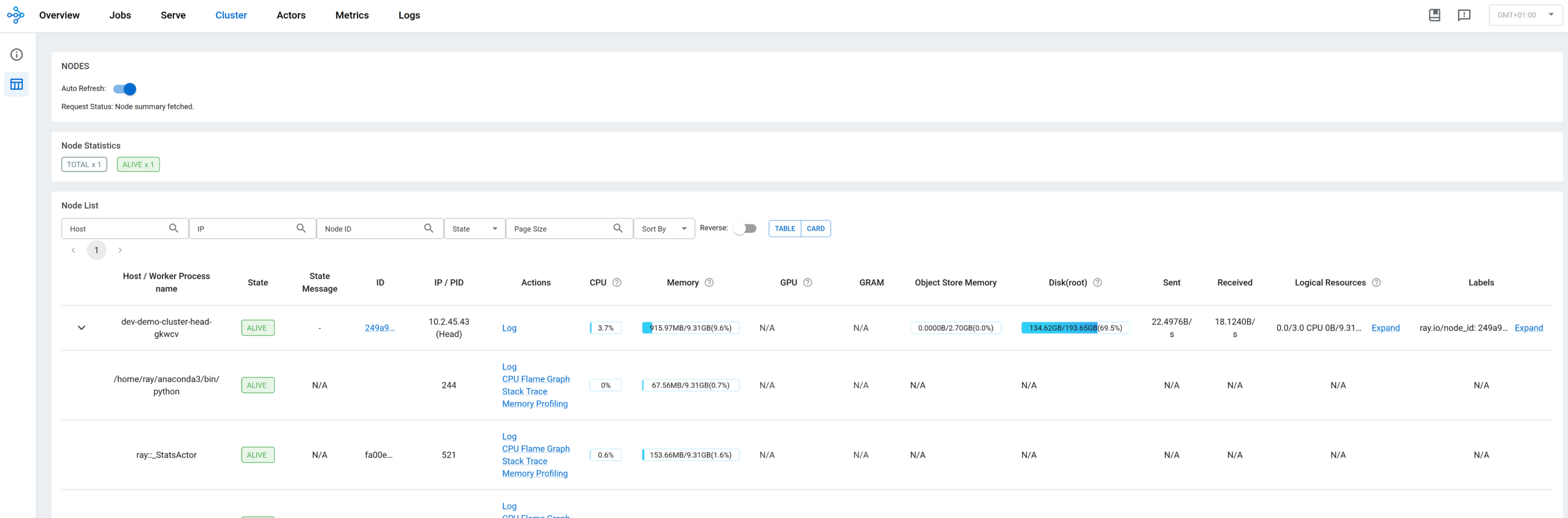 Cluster tab provides a summary of all active Ray nodes, including key resource metrics like CPU, memory, and disk usage. You can click on a node ID to reveal a detailed performance breakdown.