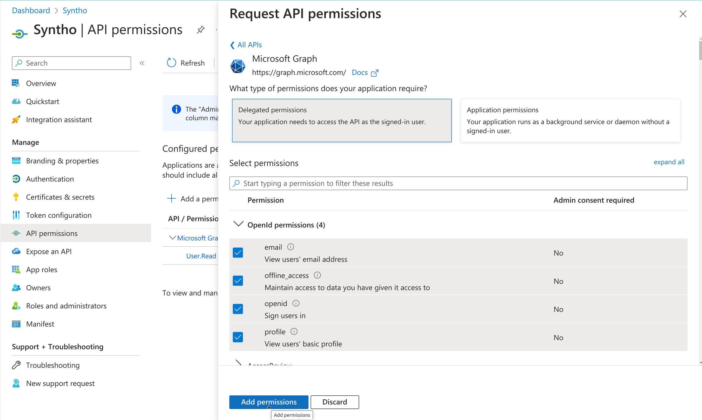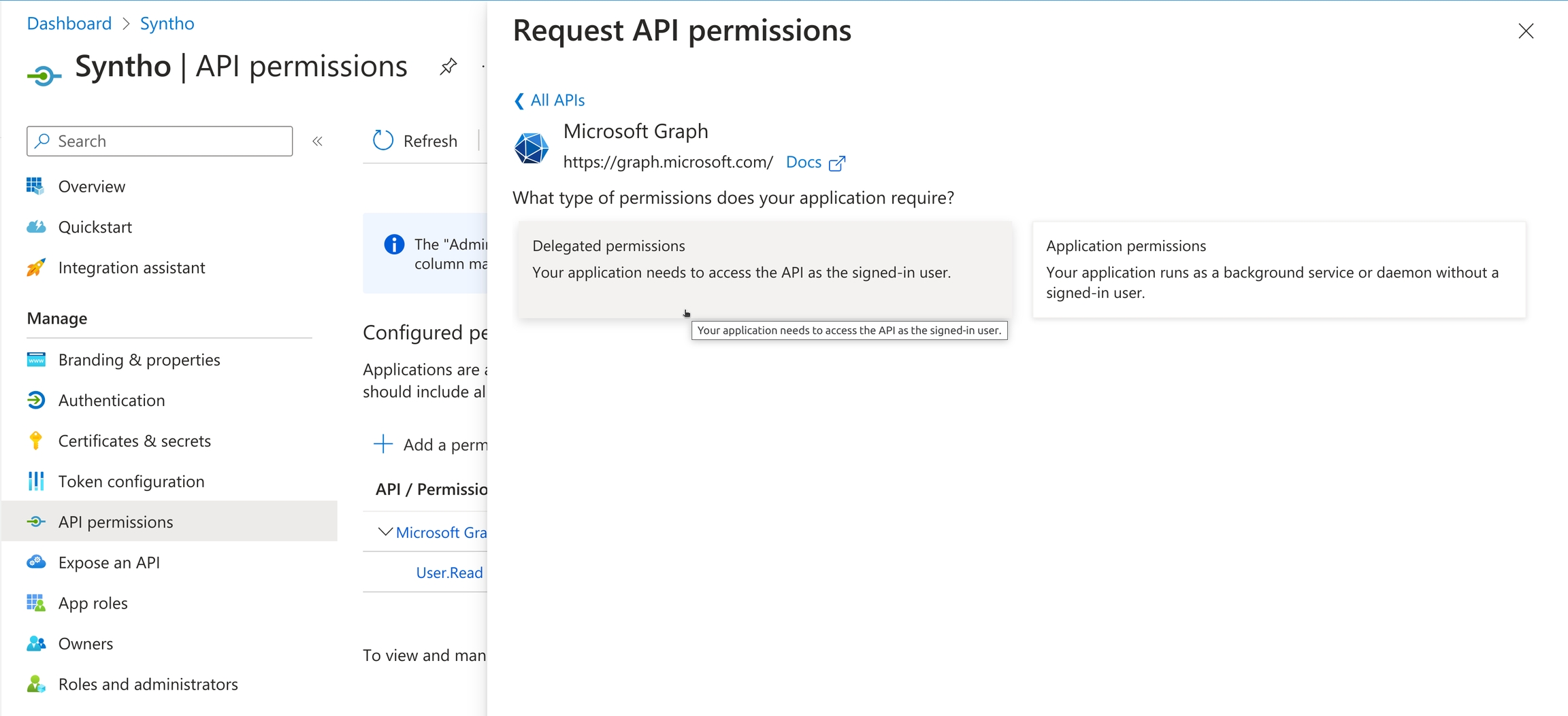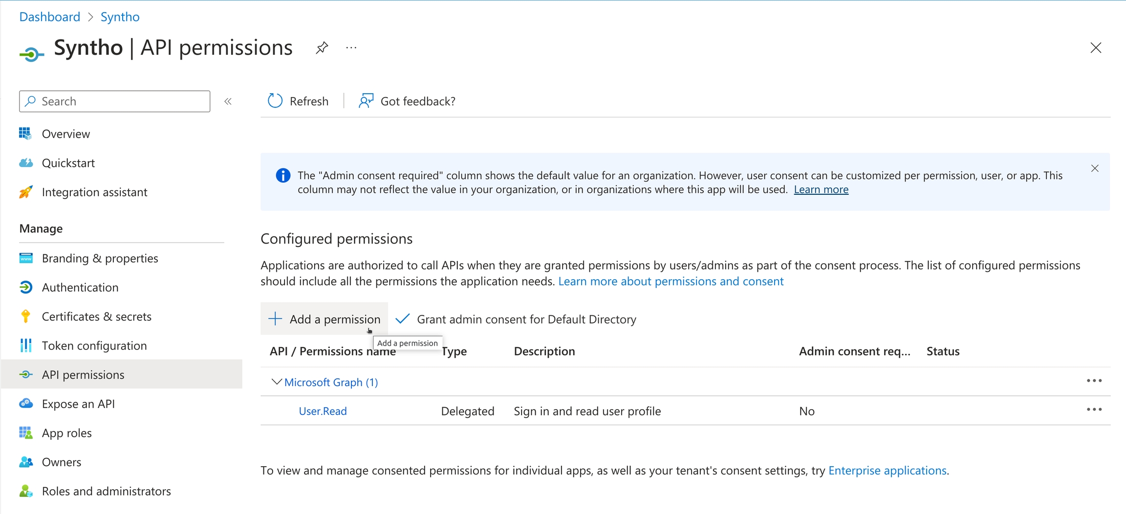 First, register Syntho as as an application in the Azure Active Directory Portal: