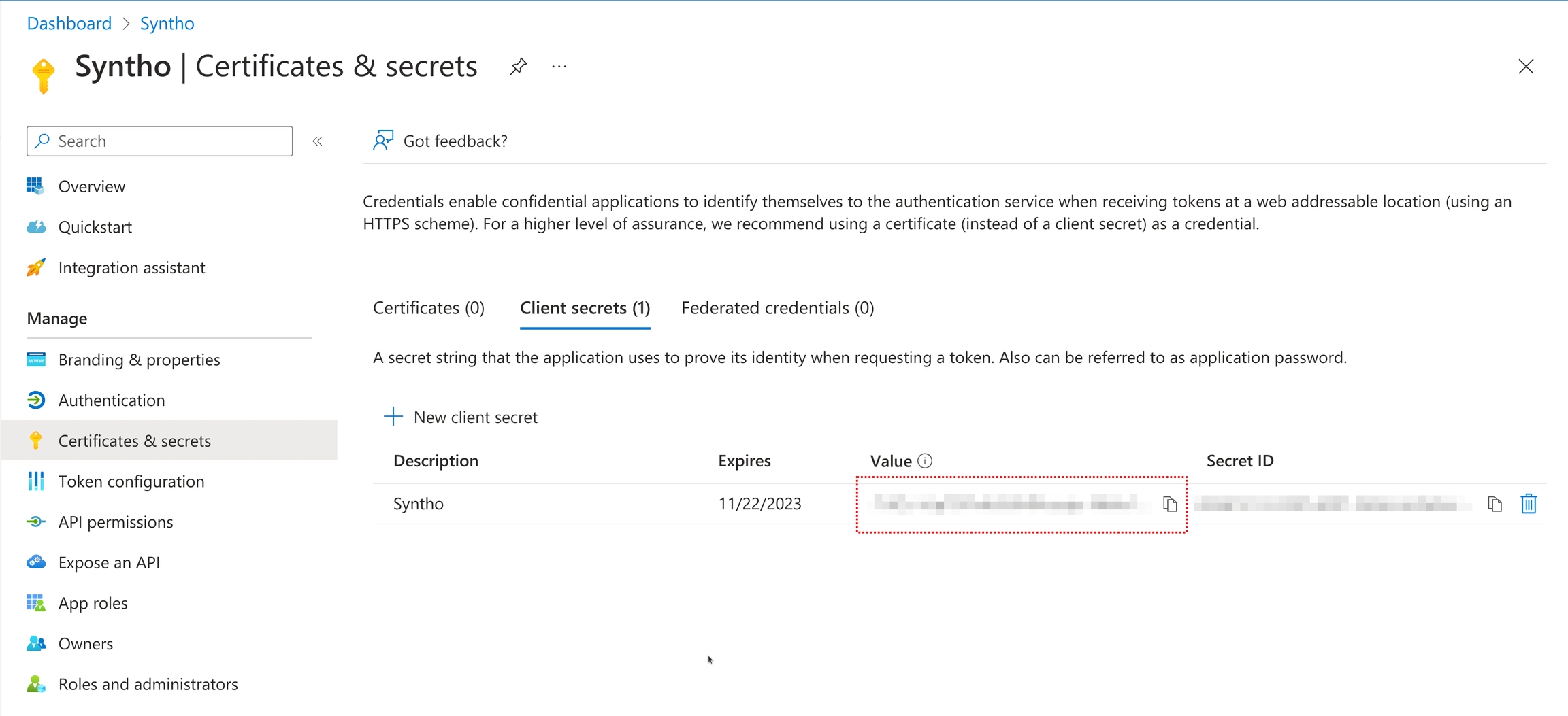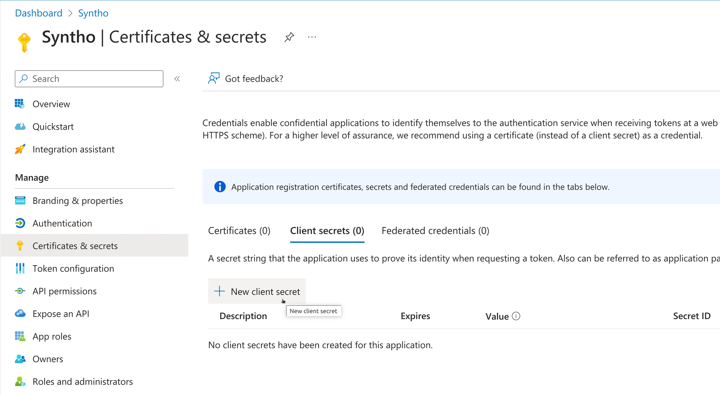 Click on "Certificates & secrets", and select "New client secret". Enter a name, for example Syntho, select an expiration and click "Add"