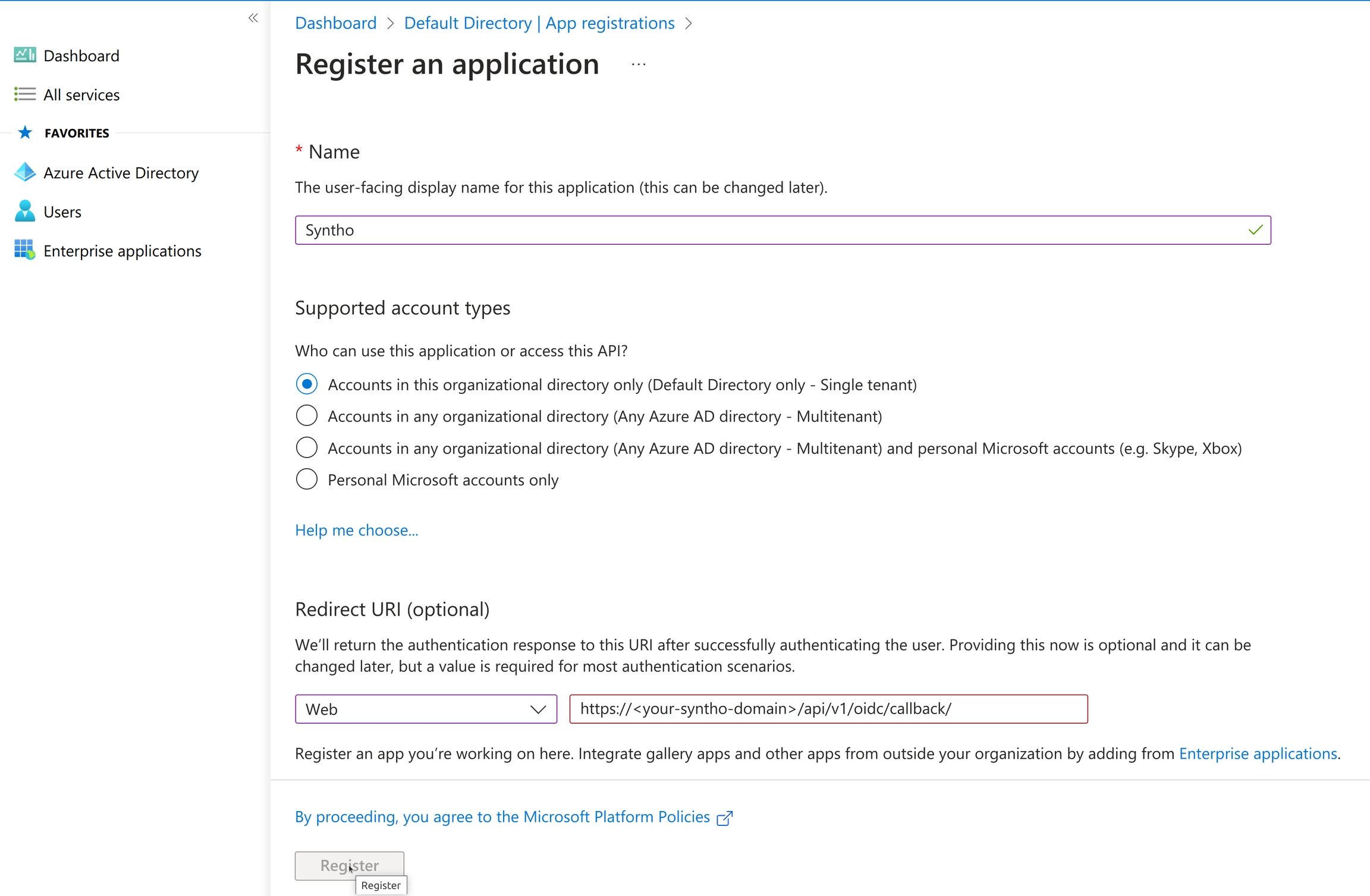 Enter a name, for example Syntho. For Redirect URI, select Web and enter the url that points to the
