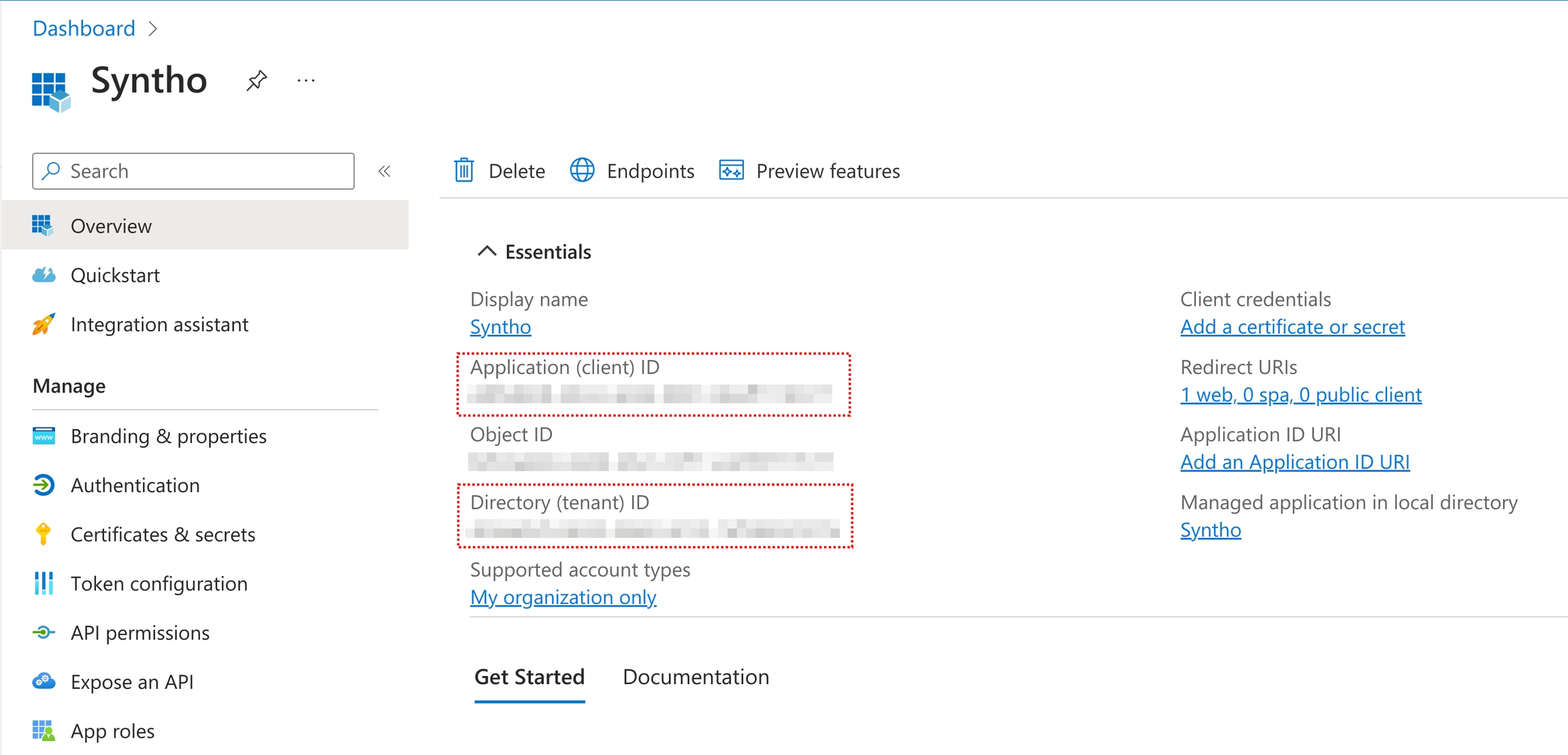 Copy the "Application (client) ID" and "Directory (tenant) ID", these values are used later.