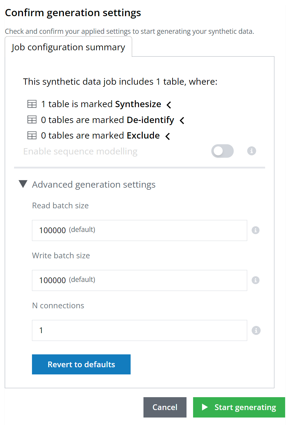 2. On the **Job configuration summary** panel, adjust generation parameters as desired.