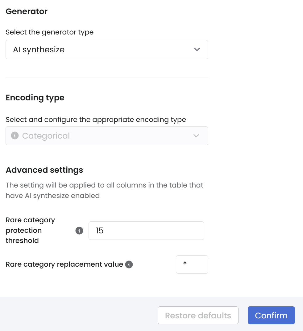 This feature helps hide sensitive or rare observations, like specific occupations in the **census** table, by replacing them with a user-defined value, enhancing data privacy. Adjust the **rare category protection threshold** and **replacement value** in **Column settings > Encoding type > Advanced settings**.