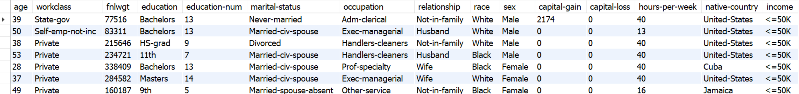 For this key use case, a single table, named **census**, containing census-collected data, requires to be synthesized using Syntho's AI synthesize generator. Maximum privacy, alongside the generation of highly realistic data that statistically reflects the original dataset, is crucial for AI and analytics. The initial step involves creating a workspace in Syntho, linked to a census database. Once established, this workspace will feature the **census** table exclusively. Below, the table's columns and a sample of the contained data are presented.