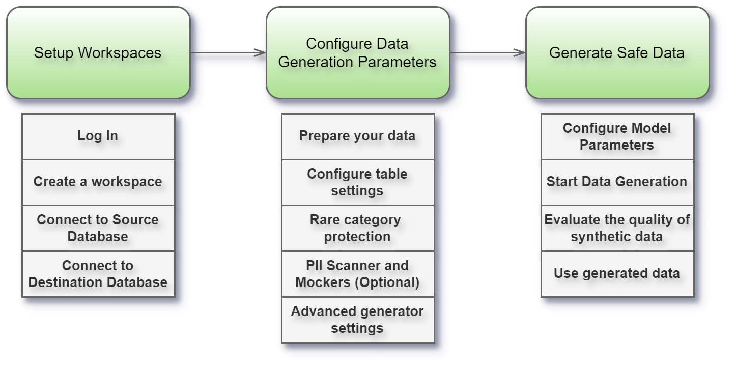 The diagram below illustrates a workflow for AI-generated synthetic data. Detailed information about each step shown in the diagram is provided throughout this page.