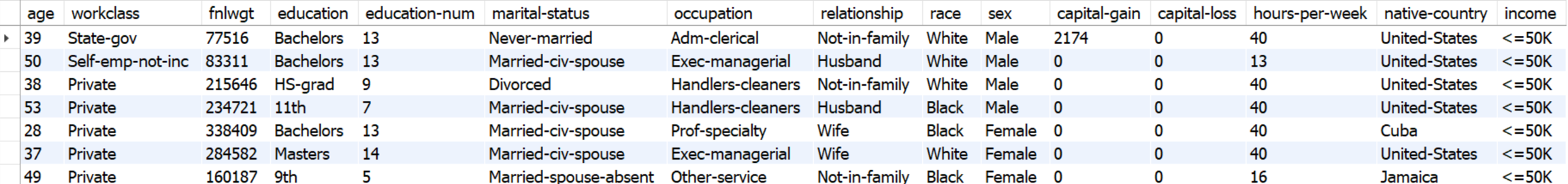 For this key use case, a single table, named census, containing census-collected data, requires to be synthesized using Syntho's AI-powered generation. Maximum privacy, alongside the generation of highly realistic data that statistically reflects the original dataset, is crucial for AI and analytics. The initial step involves creating a workspace in Syntho, linked to a census database. Once established, this workspace will feature the census table exclusively. Below, the table's columns and a sample of the contained data are presented.