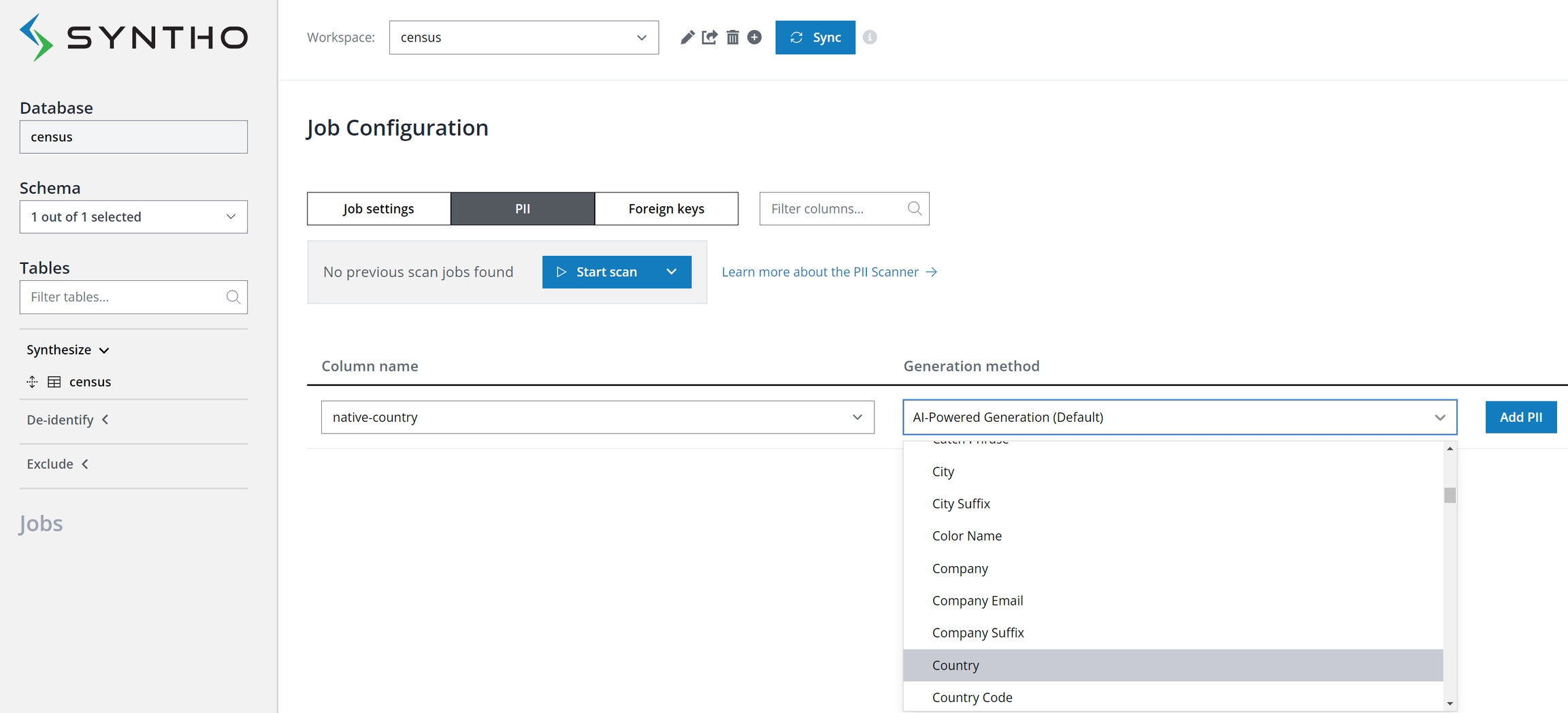 In the PII tab, you can add new columns to the list of PII columns, either manually or by using Syntho's PII scanner. You have the option to manually label columns containing PII by selecting the column name and optionally choosing a mocker to apply. Clicking "Confirm" will mark the column as containing PII and confirm the mocker selection.