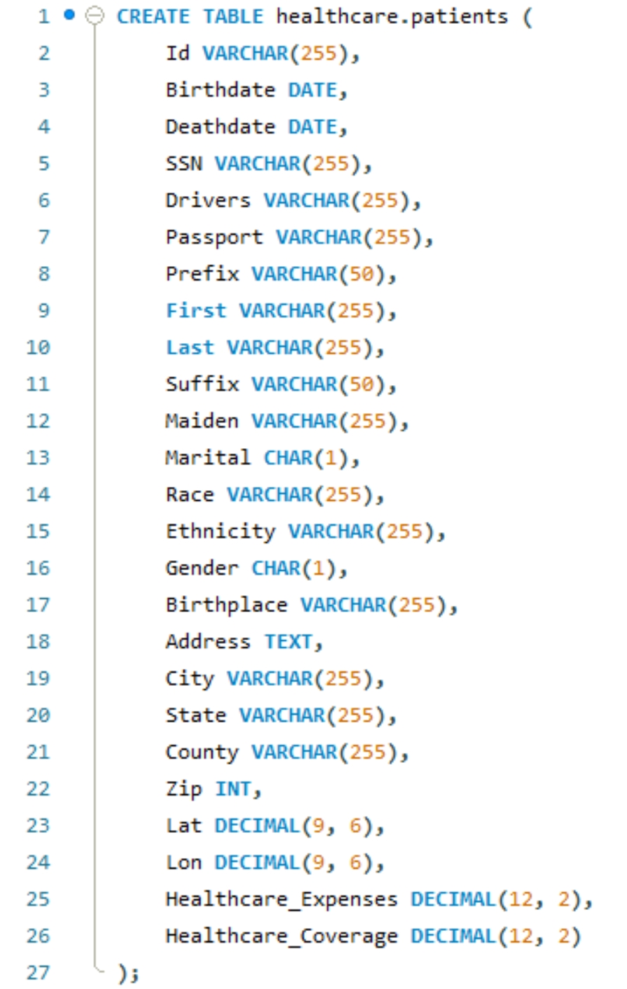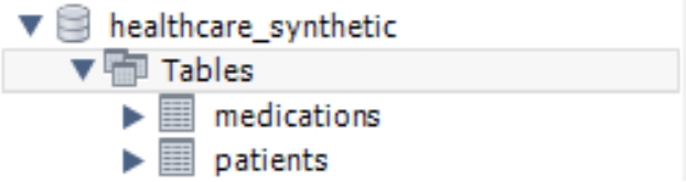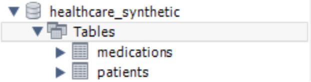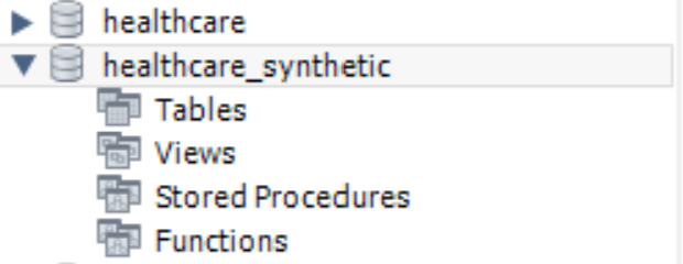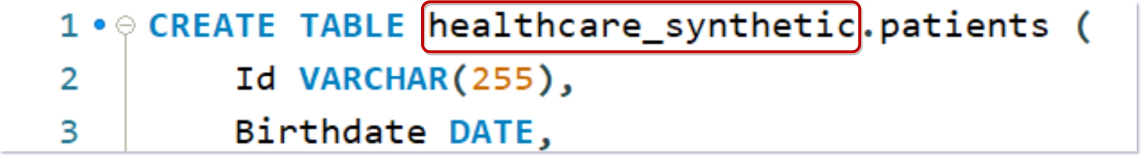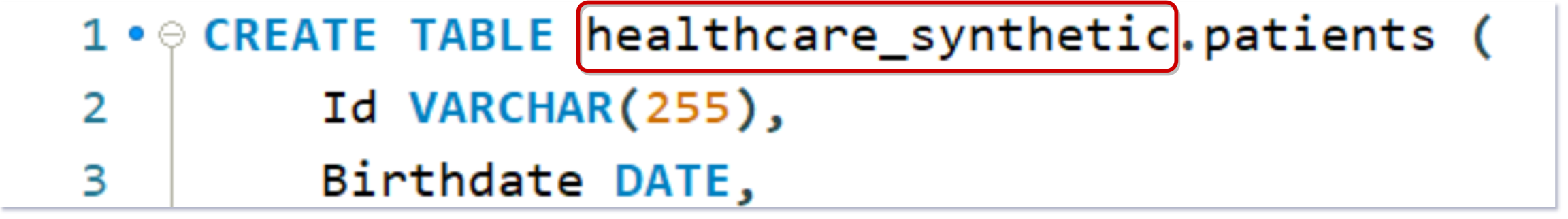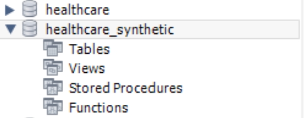 Towards the end of preprocessing, empty schema and tables for the target destination will be established, mirroring the healthcare schema creation process. However, adjustments are made to specify the healthcare_synthetic schema.