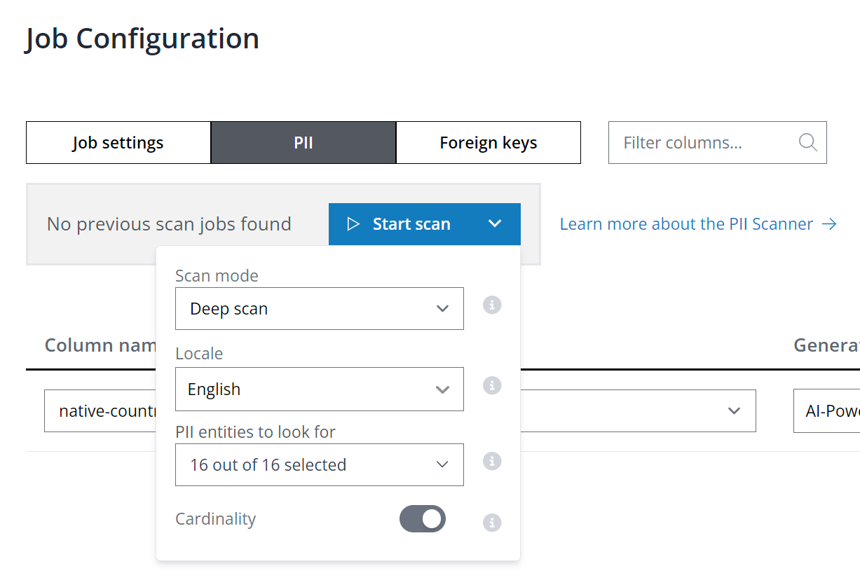 Alternatively, deploy automatic PII discovery with the PII scanner. Launch a scan to detect PII across all database columns from the PII tab in the Job Configuration panel. Note that the scanner offers both Shallow and Deep scan modes: