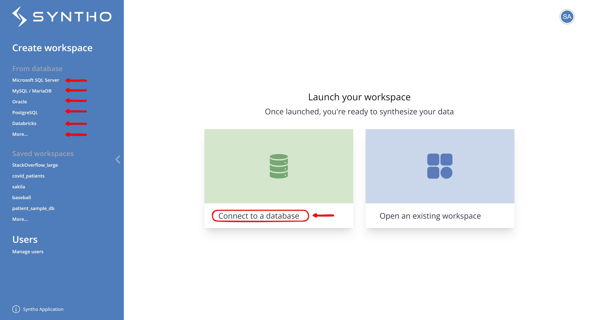 Our database is now ready. Next, we'll open Syntho to create a workspace. For detailed instructions on creating a workspace in Syntho, please consult the Create a workspace section in the Syntho documentation. To create a new workspace, you have two options: