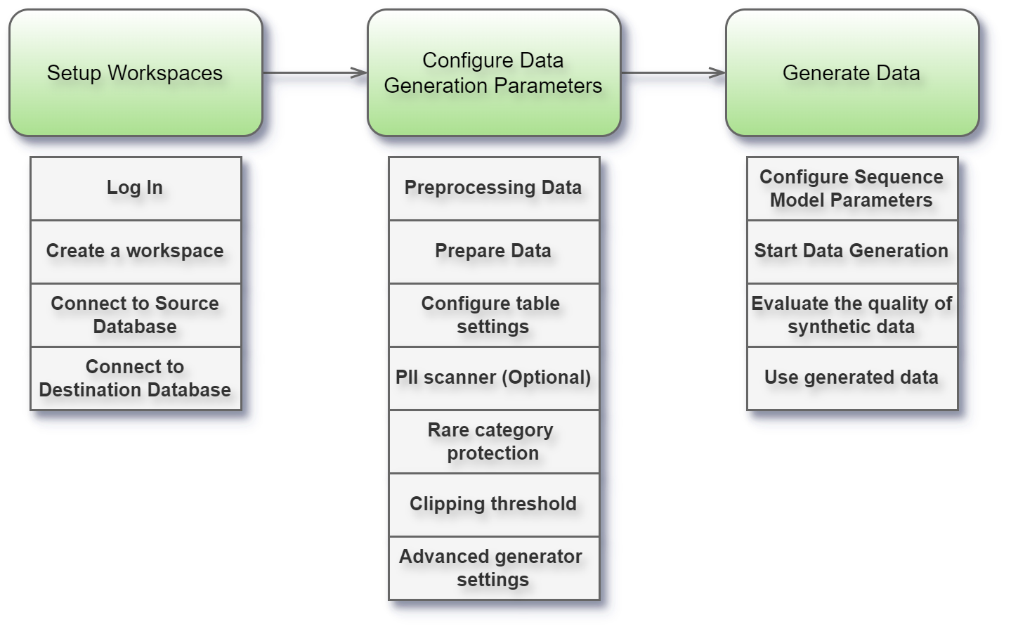 The process involves storing these tables in a database linked to Syntho. This database, referred to as the source, is where the data originates. Syntho then synthesizes this data and transfers it to another database, known as the destination. In this example, a MySQL database and MySQL Workbench are used to create both source and destination databases, and to upload the "Patients" and "Medications" tables to the source. Subsequently, a new workspace in the Syntho app is created and connected to these databases.