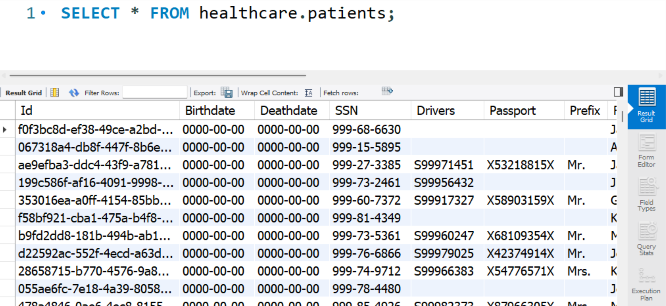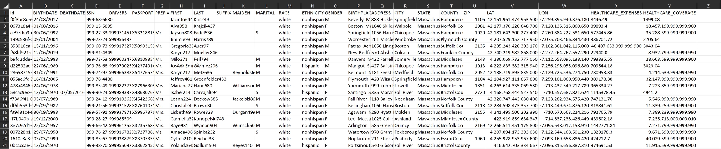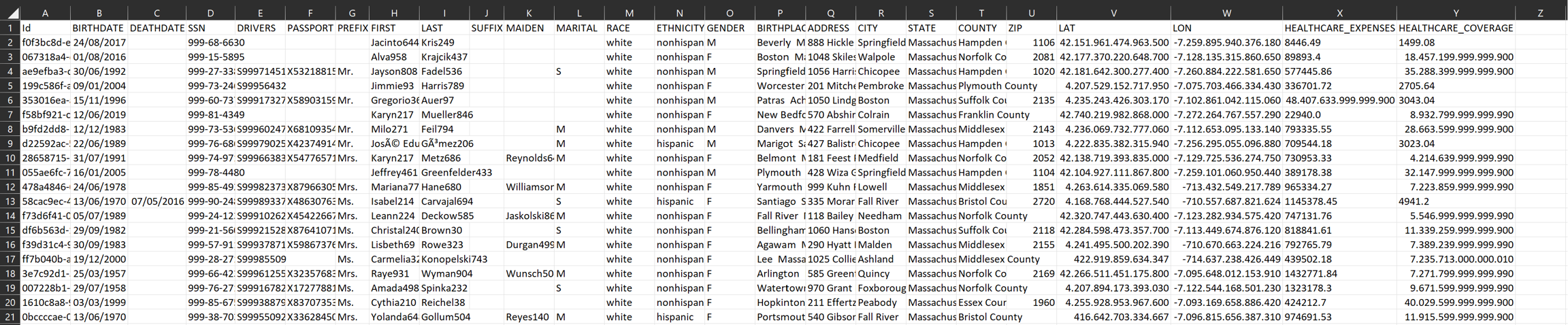 Id, BIRTHDATE, DEATHDATE, SSN, DRIVERS, PASSPORT, PREFIX, FIRST, LAST, SUFFIX, MAIDEN, MARITAL, RACE, ETHNICITY, GENDER, BIRTHPLACE, ADDRESS, CITY, STATE, COUNTY, ZIP, LAT, LON, HEALTHCARE_EXPENSES, HEALTHCARE_COVERAGE.