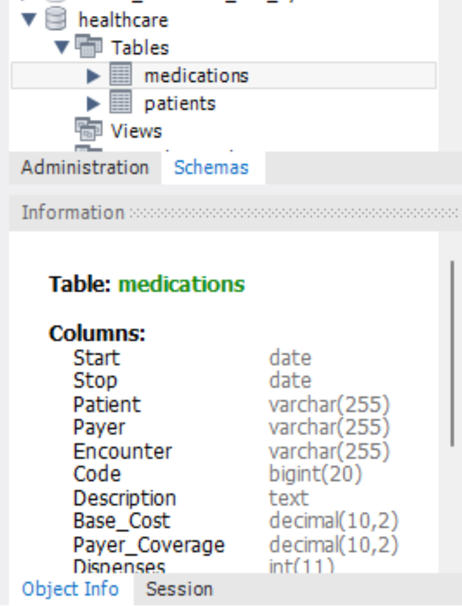Thus, we must establish 25 columns with precise values. Below, an SQL script is provided to facilitate the creation of the "Patients" table, a process similarly applied to the "Medications" table.