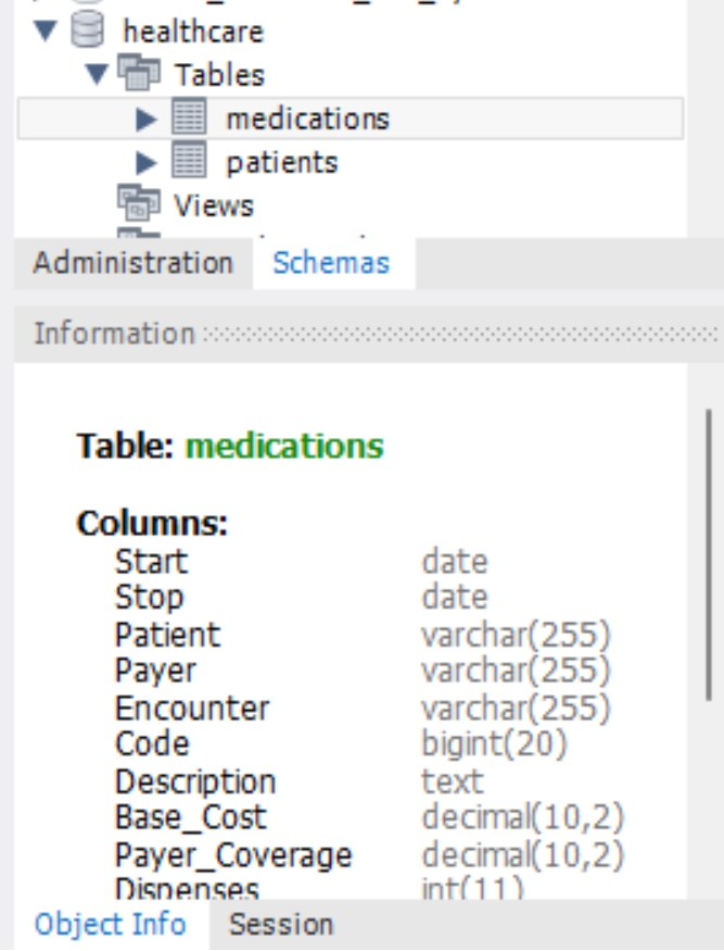 Once the "healthcare" schema is created, the tables remain empty, necessitating the next step: table creation.