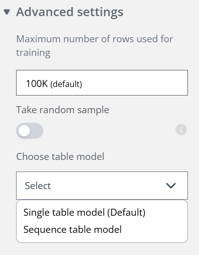 In the job settings, under table settings, you can adjust generator-level settings, including the maximum number of rows for training to optimize speed. Leaving this setting as None utilizes all rows. The "Take random sample" option allows for sampling: