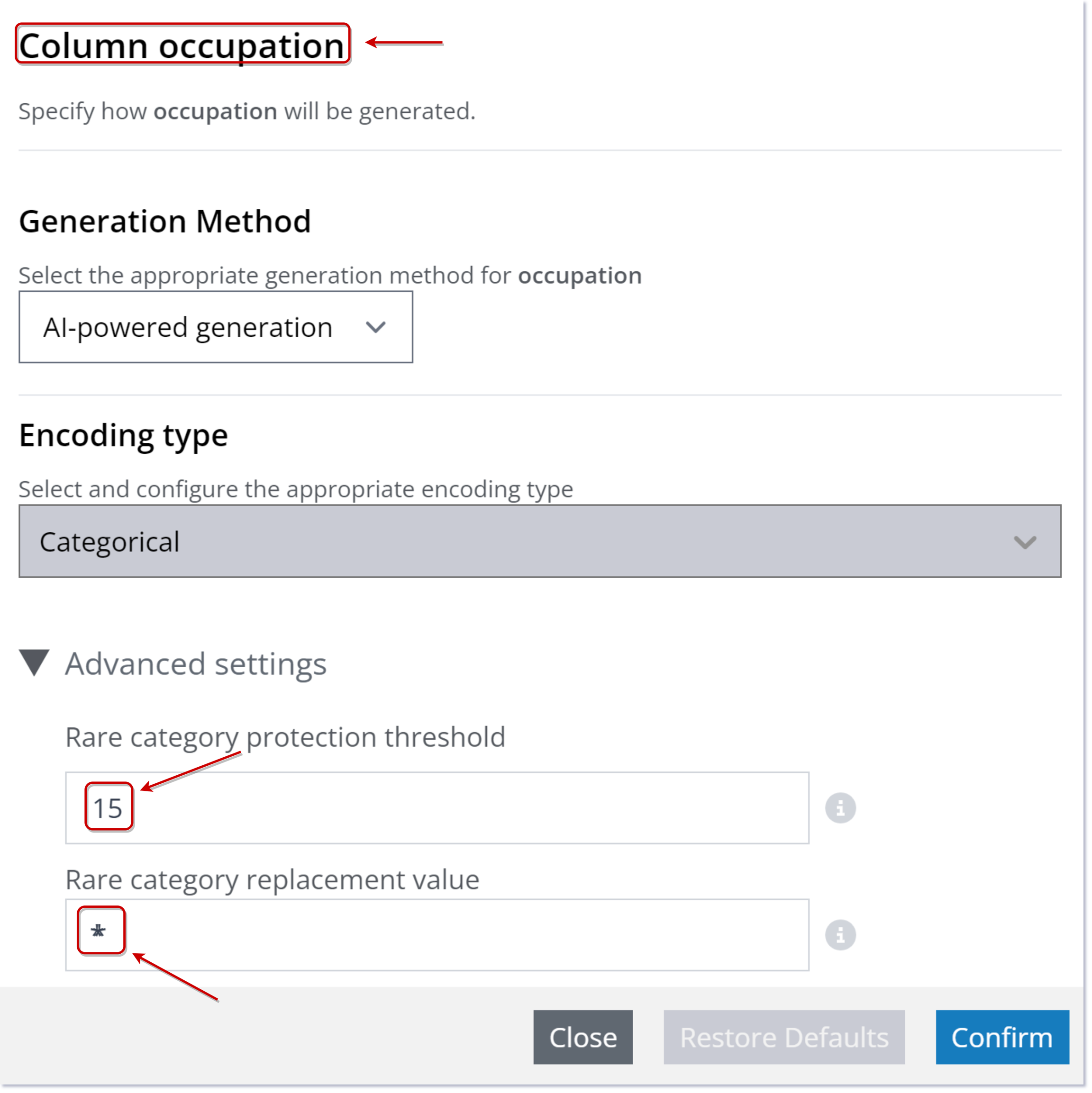 Rare category protection threshold: All column values that occur as frequently or less than the rare category protection threshold are automatically replaced.