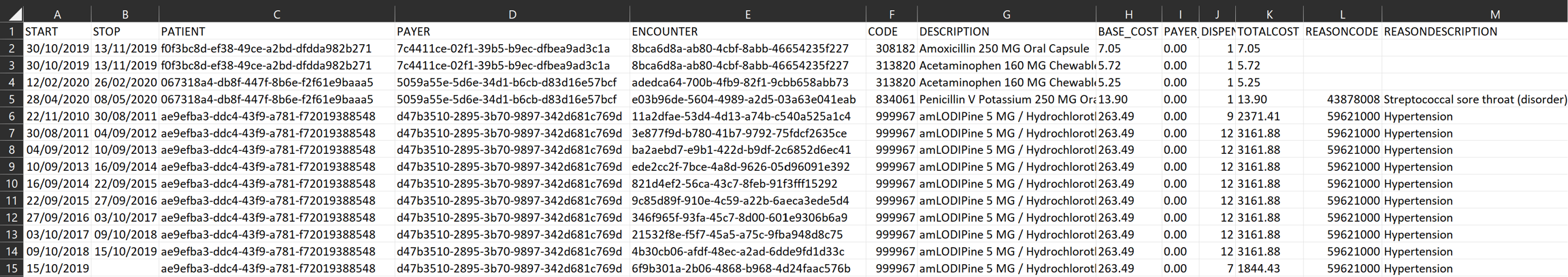 Initially, data from these tables are extracted from the customer's database in .csv format. An overview of the first few columns for both "Patients" and "Medications" tables is provided.