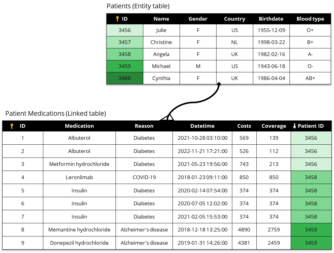 Let's consider the Patients and PatientMedications tables shown below. They are from Syntho documentation and resembles our patient and medications tables. Here, the Patients table is the entity table. The PatientMedications tables is the linked table.