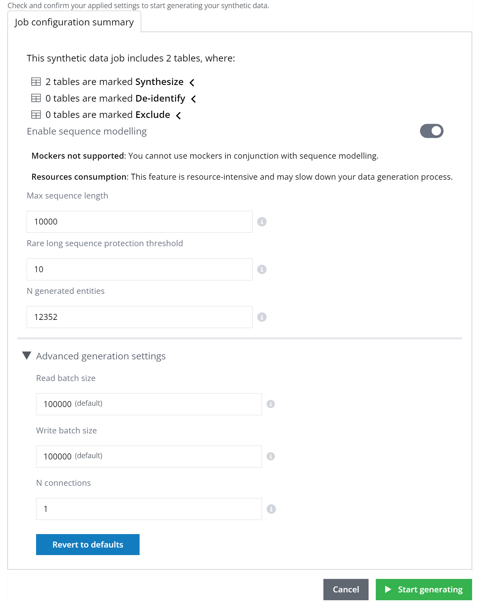 Resource Consumption: Due to its resource-intensive nature, this feature might decelerate your data generation process. It's advisable to lessen your input data or tweak the sequence model parameters to economize time and resources.