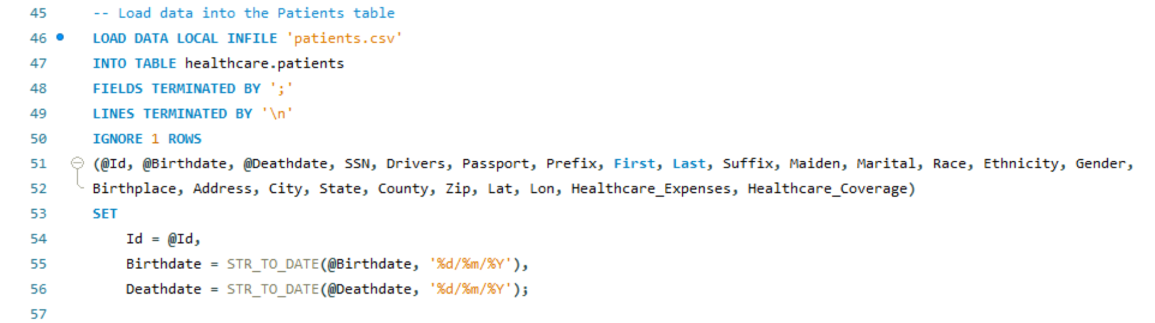To reconcile date format discrepancies between the CSV file (DD/MM/YYYY) and MySQL's expected format (YYYY-MM-DD), the last four lines of the script adjust the date formatting. This adjustment prevents MySQL from defaulting unrecognized dates to '0000-00-00', utilizing the STR_TO_DATE function for conversion during import. Subsequently, the "patients" table will be populated.