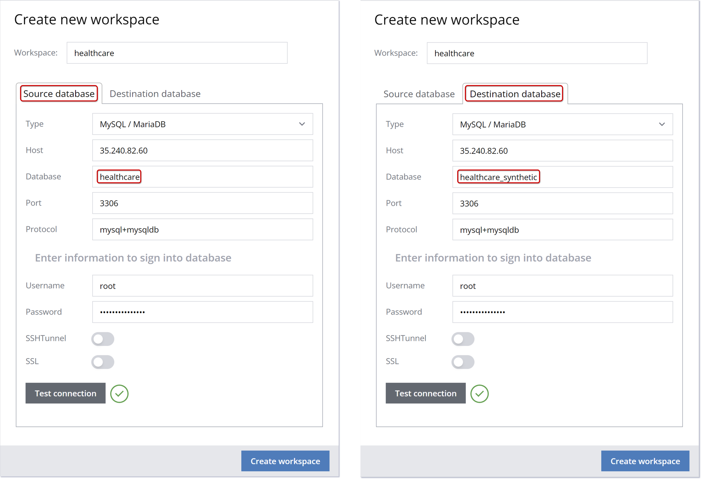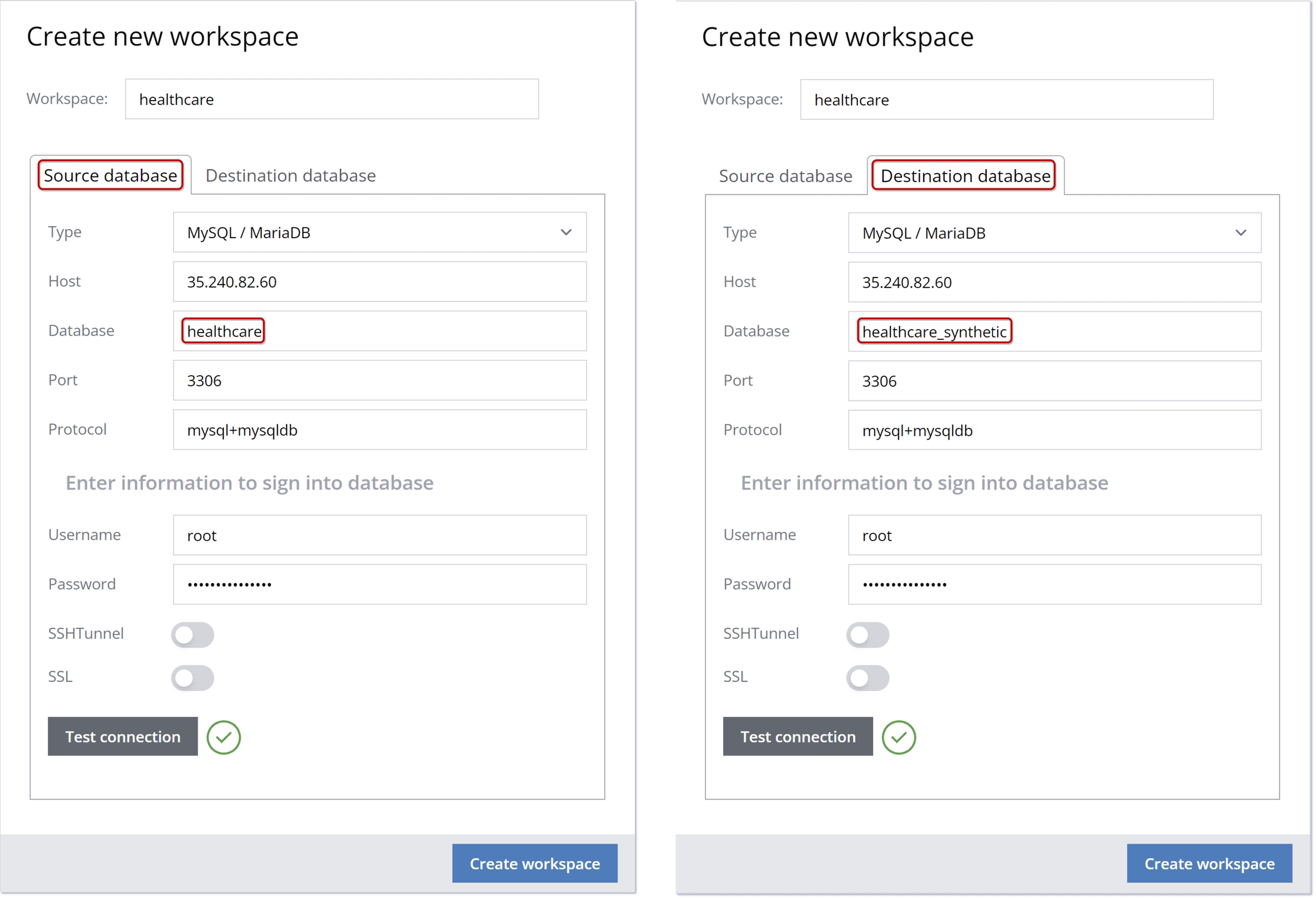 With the tables set for the synthetic schema, the database is ready. The next step involves creating a workspace in Syntho. For workspace creation, refer to the Syntho documentation or follow the provided steps, ensuring the MySQL database connection details are accurately filled. Successful connection testing, indicated by a green circle, will be required for both the source and destination databases.