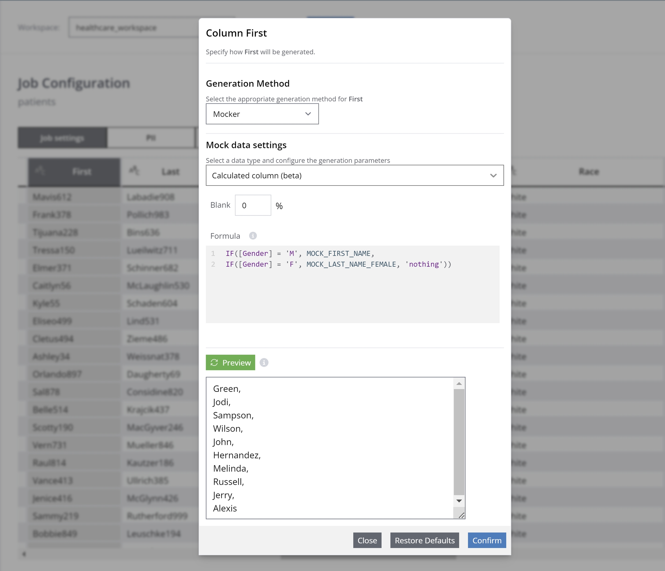 Another example is the first name mocker. Imagine having a table with a column for first names. However, the user wants to generate male mock data for male names and female mock data for female names based on checking their gender in the gender column. This request can be expressed using the formula below: