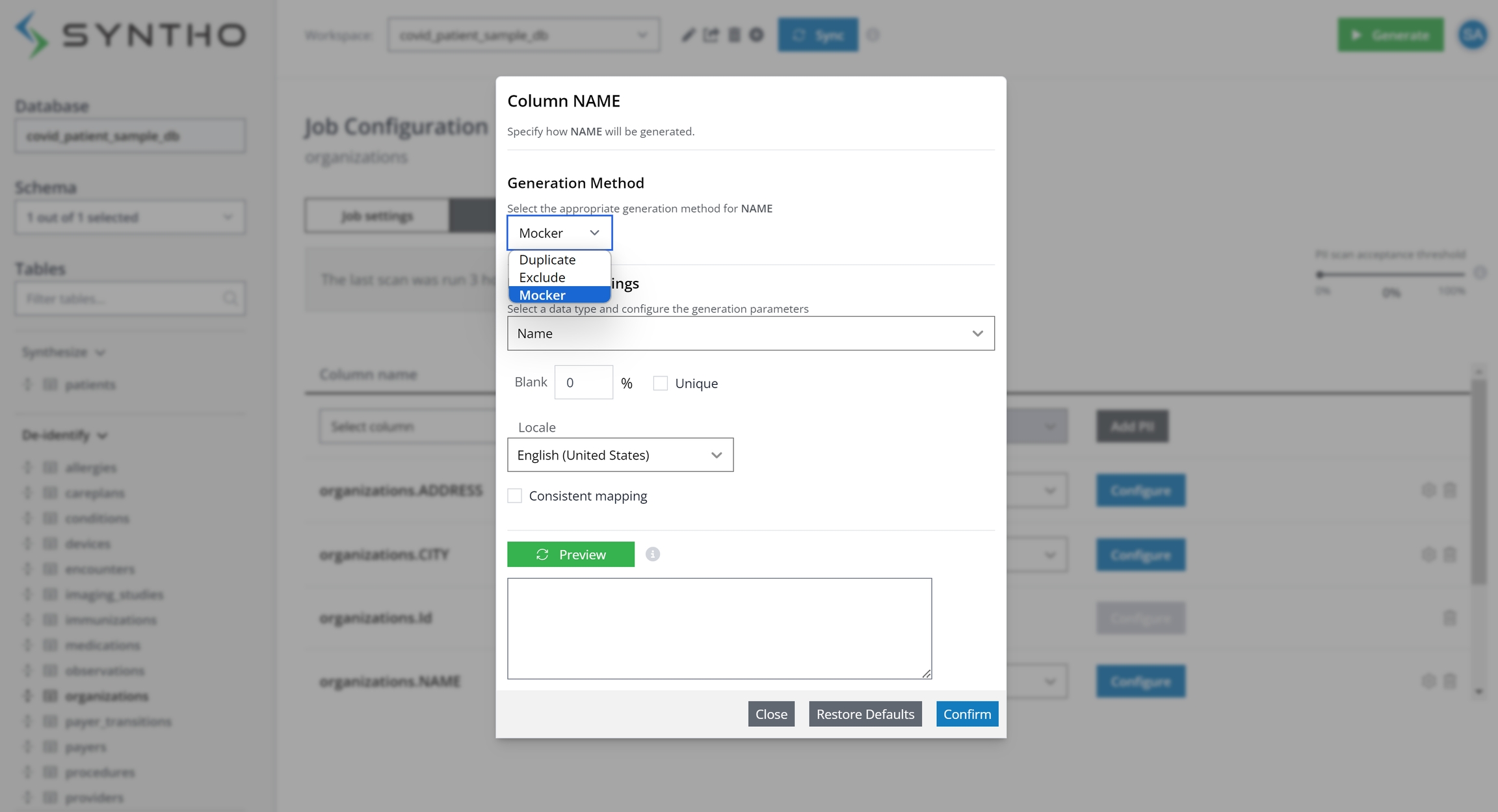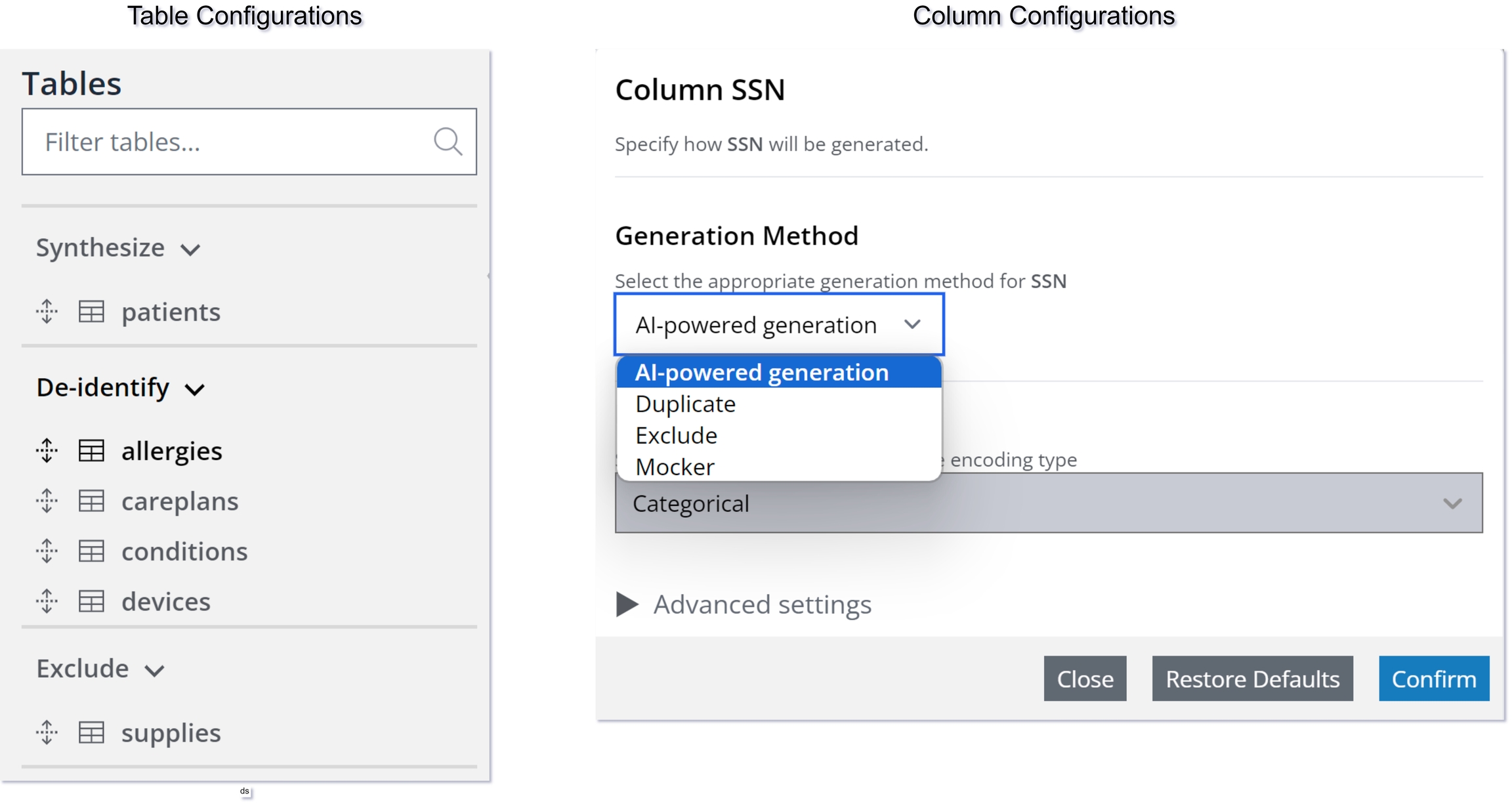 Using these modes, you can safely de-identify PII by either replacing it with mock data (Mockers) or excluding it (Exclude) from the target database (for more information, see Configure column settings).
