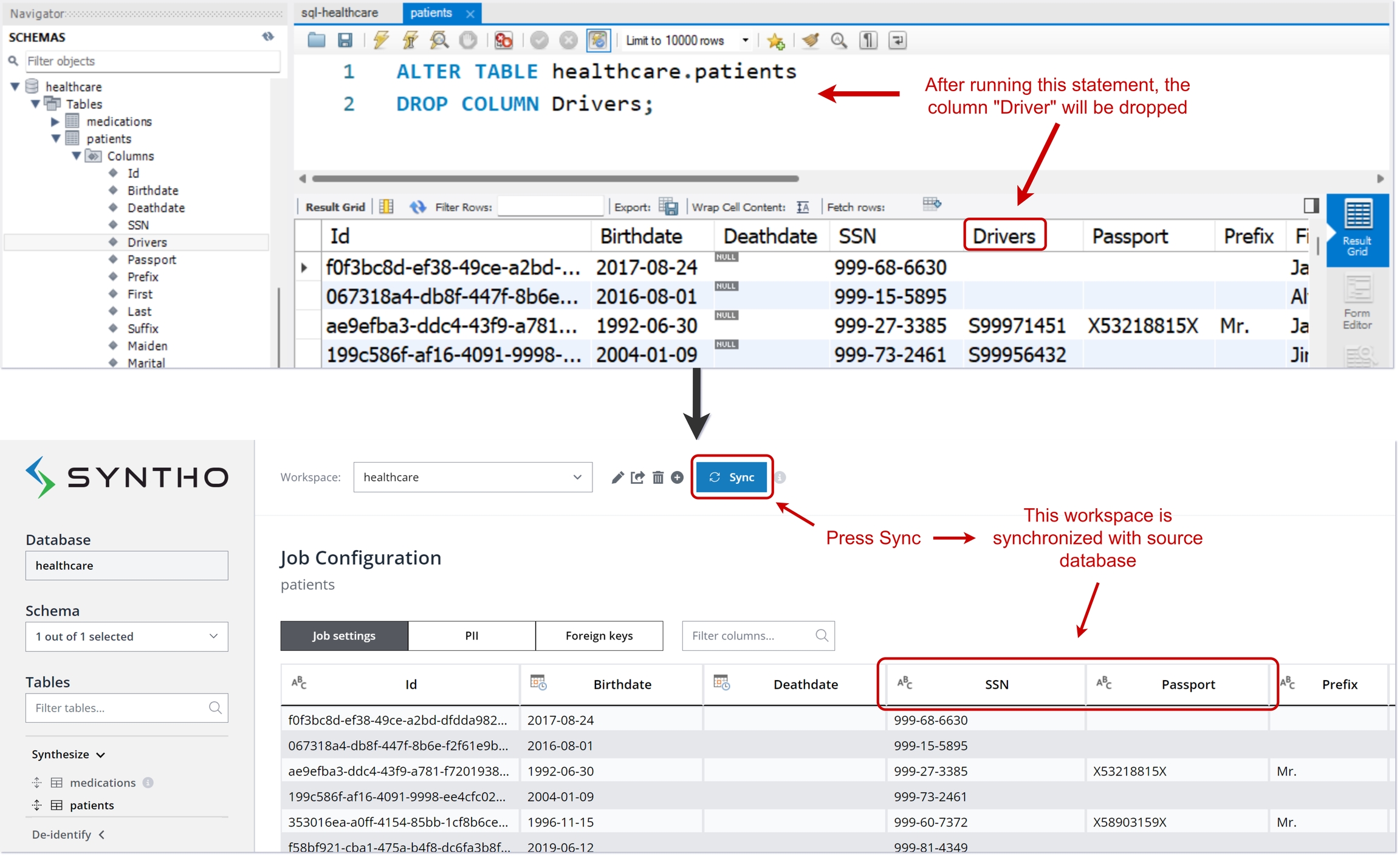 Let’s assume we have a source database called healthcare and the column “Drivers” was removed from the table patients in the source MySQL database. After removal of the column, when you press Sync button, it will show the current version of the source database.