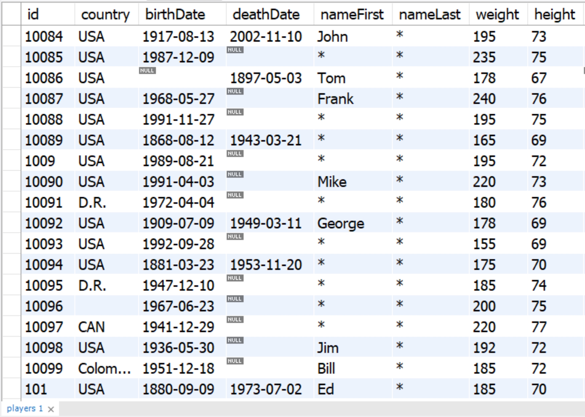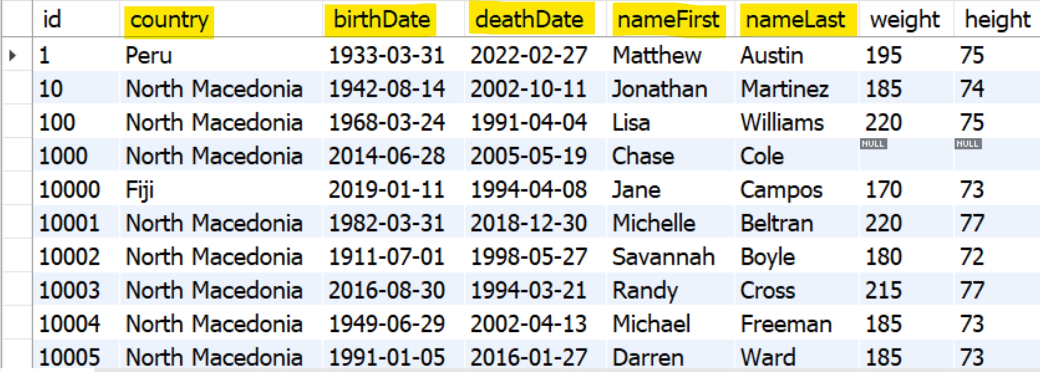 Mockers are applied to specific columns in the players table, which are highlighted in yellow in the table above: 'country', 'birthDate', 'deathDate', 'nameFirst', and 'nameLast'.