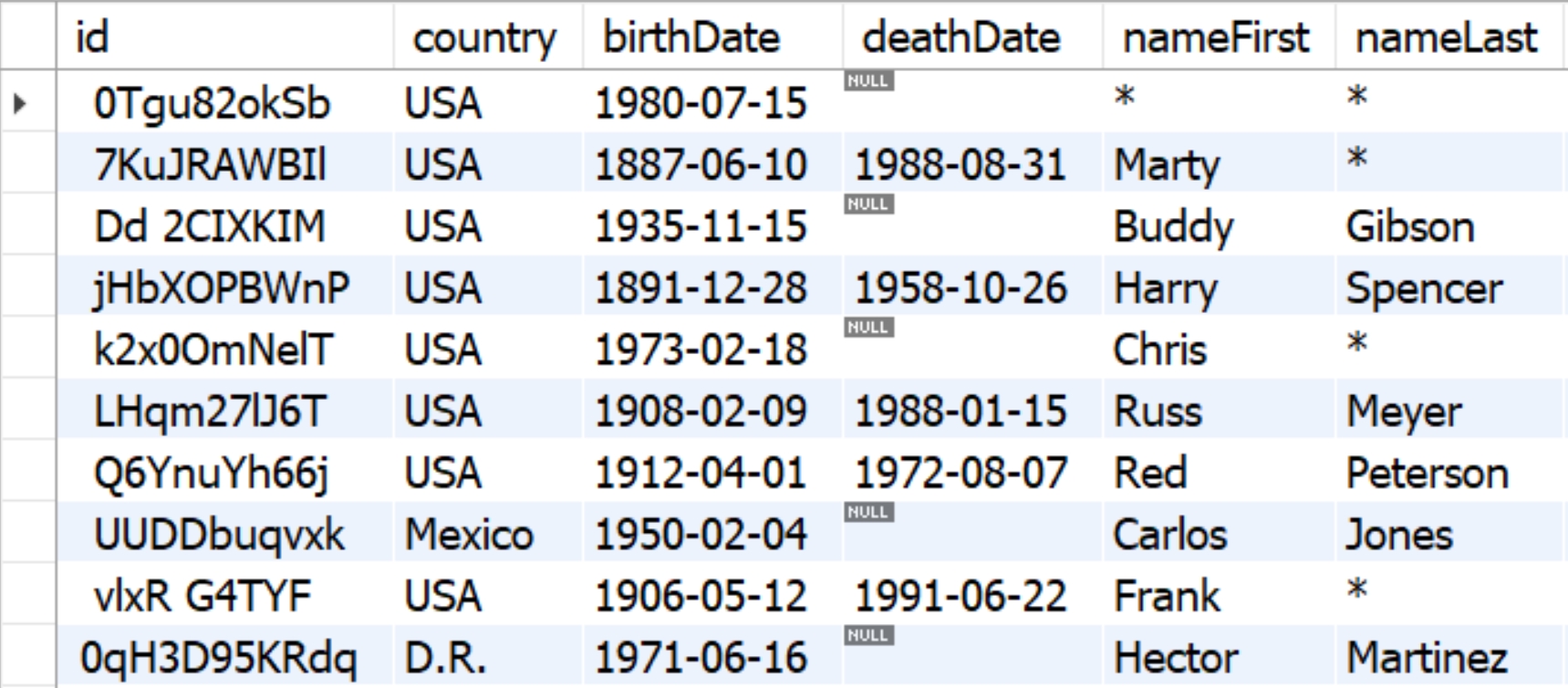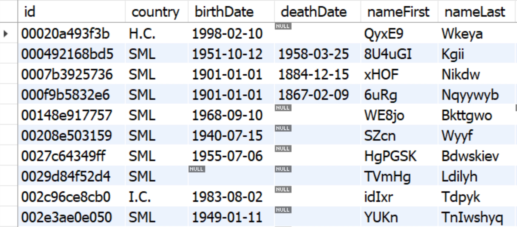 If you enable consistent mapping, the values will be consistently mapped to the same value across the tables. For example, we enabled consistent mapping for two columns: "nameFirst" and "nameLast". We want to generate the same synthetic names and surnames (mockers) for the original names. See the illustrations from MySQL tables below, where mockers with consistent mapping map the name "Bill Kennedy" to "Danielle Olson".