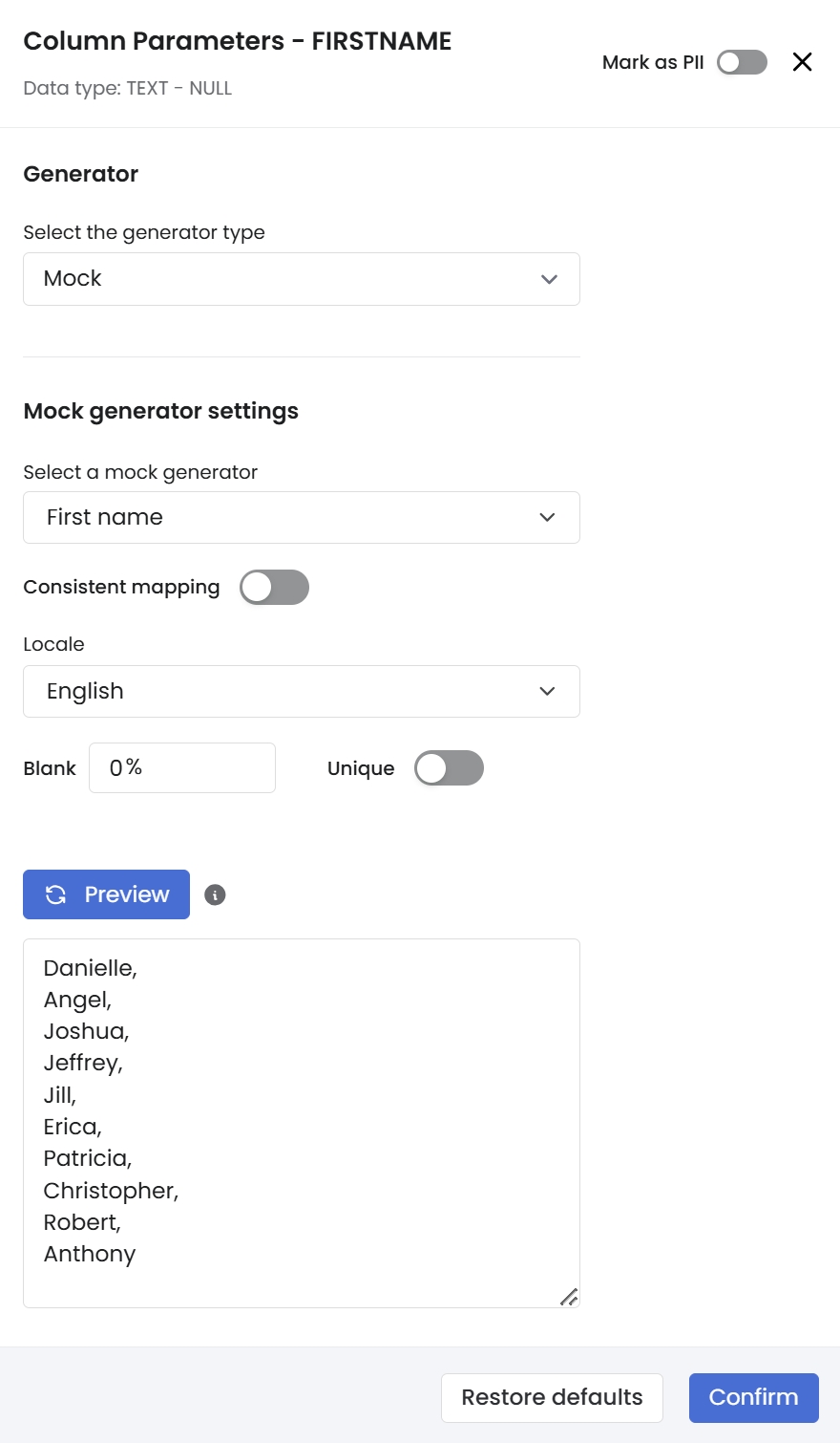 In this example, the Hash generator is applied to key columns in the players table to ensure unique identifiers while preserving referential integrity. Key column, which is id, is hashed using a consistent algorithm to create anonymized yet unique values. This method ensures that identifiers in the players table can be anonymized without compromising the ability to link related records across tables. With unique hashing enabled, the output value will always be unique.