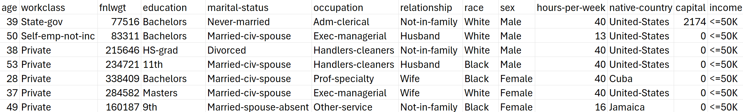 <figure><img src="https://content.gitbook.com/content/U61B9DqtWCNO3Z30vnjh/blobs/hyXu75SB4XzcawHGUCyy/image.png" alt=""><figcaption><p>A screenshot from census dataset</p></figcaption></figure>